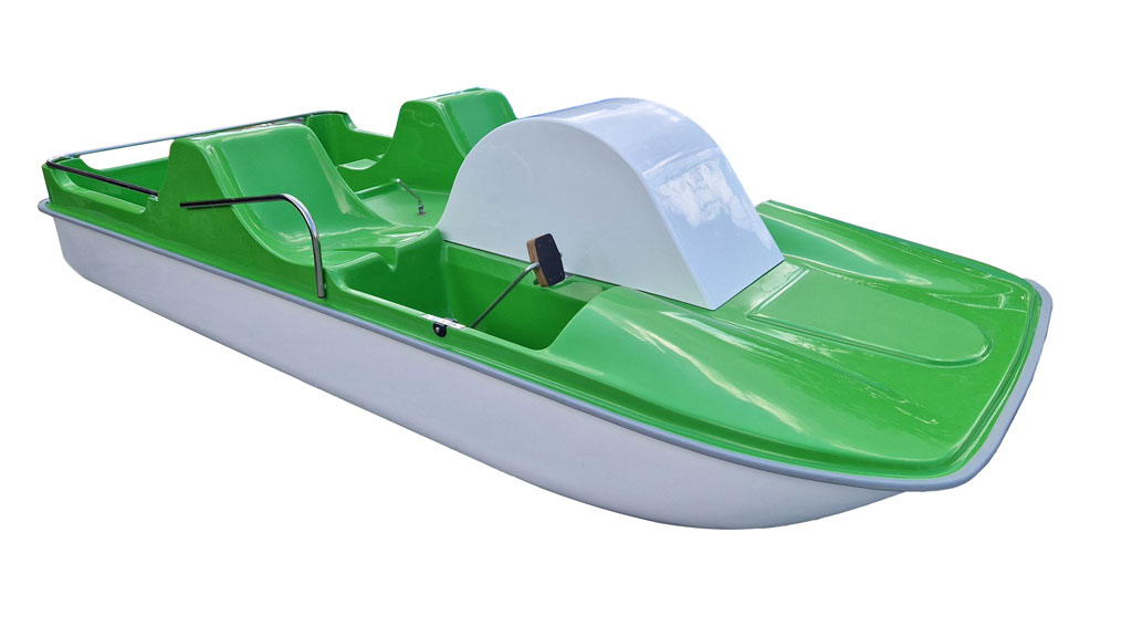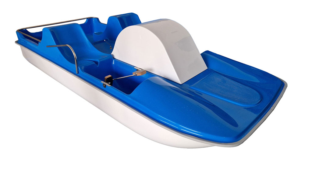 Tretboot für 4 Personen, Modell „380“ mit Becken. Eine ältere Konstruktion, die mehrmals modifiziert wurde, z. B. durch das Hinzufügen von zwei Sitzplätzen im Becken, Geländern aus rostfreiem Stahl und längeren Schwimmkörpern im Heckteil, um die Verdrängung des bewährten und hoch geschätzten Modells zu erhöhen. Besonders hoch eingeschätzt bei langen Fahrten von Eltern mit Kleinkindern.