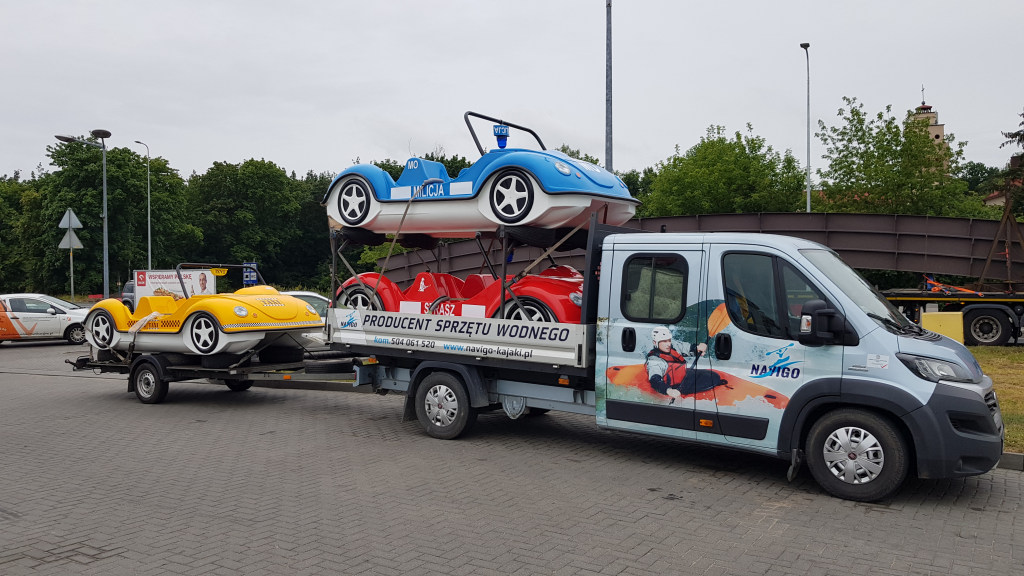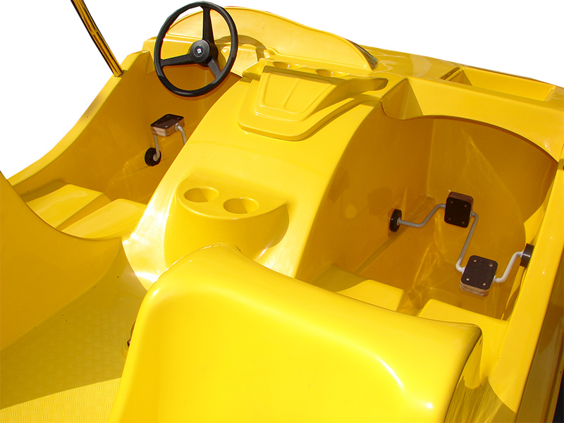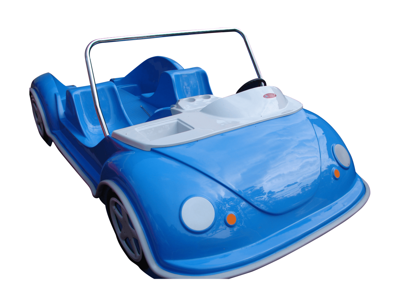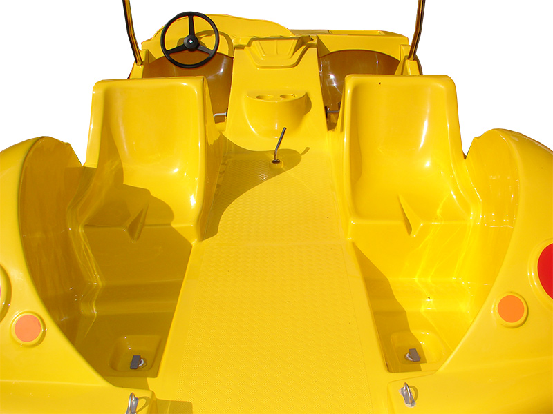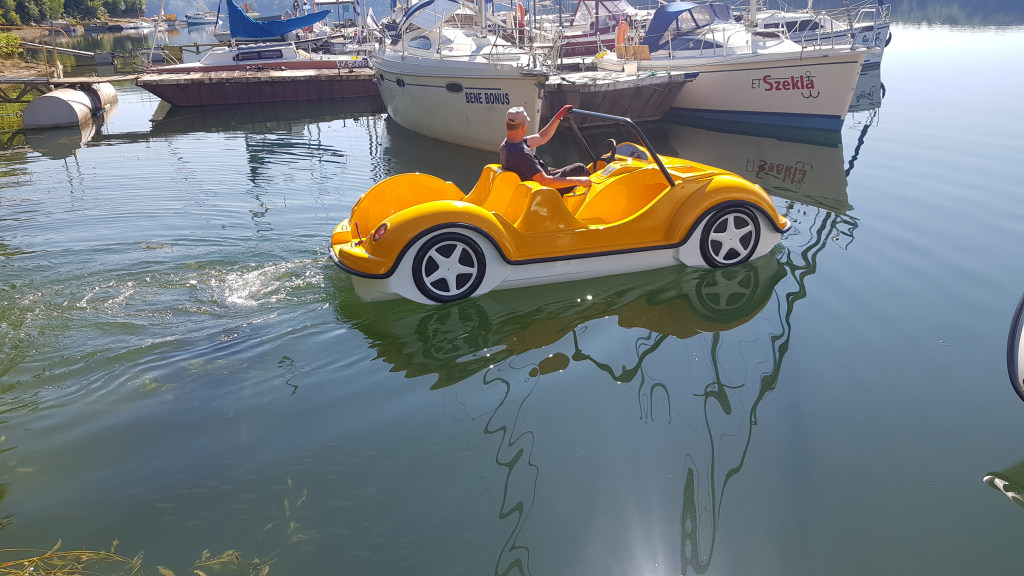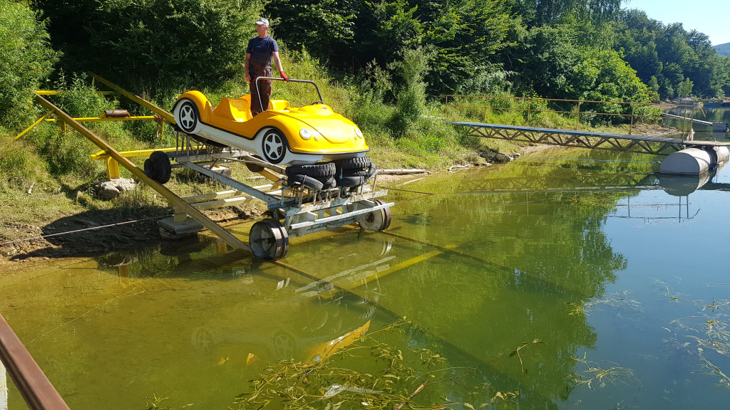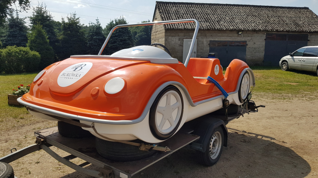 Ein fantastisches Cabrio-Tretboot (allgemein als Garbus oder Tretboot Beetle bekannt), das einen riesengroßen Eindruck macht und mit seinem Design überrascht, wenn es auf dem Wasser erscheint. Es ist für vier Personen geeignet und wird mit der Kraft der menschlichen Muskeln sowie mit dem elektrischen Motor angetrieben. Es gibt eine Möglichkeit, ein Dach an den Bügeln und eine Leiter am Heck zu montieren, um den Übergang vom Wasser ans Deck zu erleichtern. Eine Montage von zusätzlichen Ausrüstungselementen ist auch möglich.